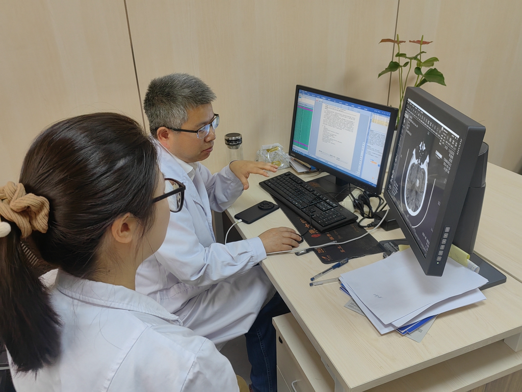 影像诊断室内,诊断医生们如同“侦察兵”,在黑白影像中探寻疾病的线索。影像中心党支部书记、中心主任程南生在假期依旧选择和大家一起坚守岗位,他紧盯着电脑屏幕,反复观察对比患者的多张影像片,不放过任何一个可疑之处。突然,一个细微的异常引起了他的注意,他立刻召集身边的年轻医生一起探讨,同时拿起电话与临床医生沟通,详细了解患者的症状和病史。经过深入分析研讨,最终确诊患者为早期肿瘤,为后续治疗争取了宝贵时间。 一个微小的阴影、一处模糊的边界,都逃不过他们的“火眼金睛”。他们深知,自己的一个判断,可能会改变患者的治疗方案和命运,因此不敢有丝毫懈怠。面对疑难病例,他们立即组织会诊,与临床科室即时沟通交流,力求给出最精准的答案。