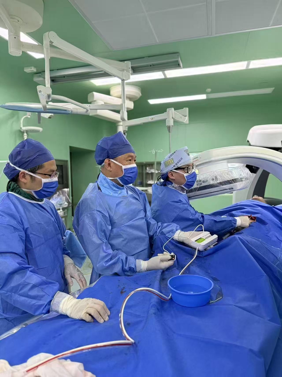 经过精心准备手术如期开展。介入与血管外科团队在DSA血管造影机引导下,严格按照操作流程,高速旋切及清除血管、支架各处的斑块等阻塞物,经过1小时操作,斑块清除彻底,闭塞血管成功开通,恢复血流。术后,患者足趾颜色马上从紫绀变回红润,皮肤温度也恢复正常,手术取得圆满成功。