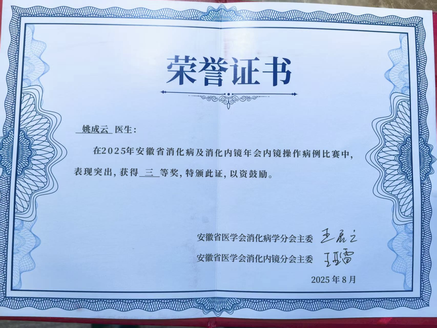 在最近举办的全省仅11家三级医院进入决赛的安徽省消化病及消化内镜年会内镜操作比赛中,安医大附属安庆第一人民医院消化内科姚成云副主任医师表现突出,荣获三等奖。