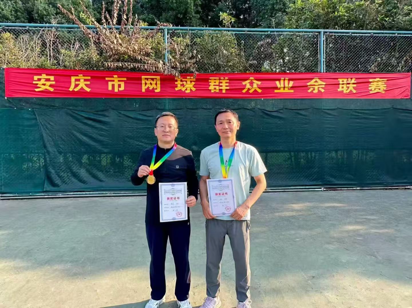 在10月12日举办的安庆市网球群众业余联赛比赛中,安医大附属安庆第一人民医院网球协会王刚会长、吴军副会长组队参加,团结协作、奋勇拼搏,凭借出色的技战术水平和良好的精神风貌,在全市众多参赛队伍中脱颖而出,荣获男子中年乙组第一名的佳绩。