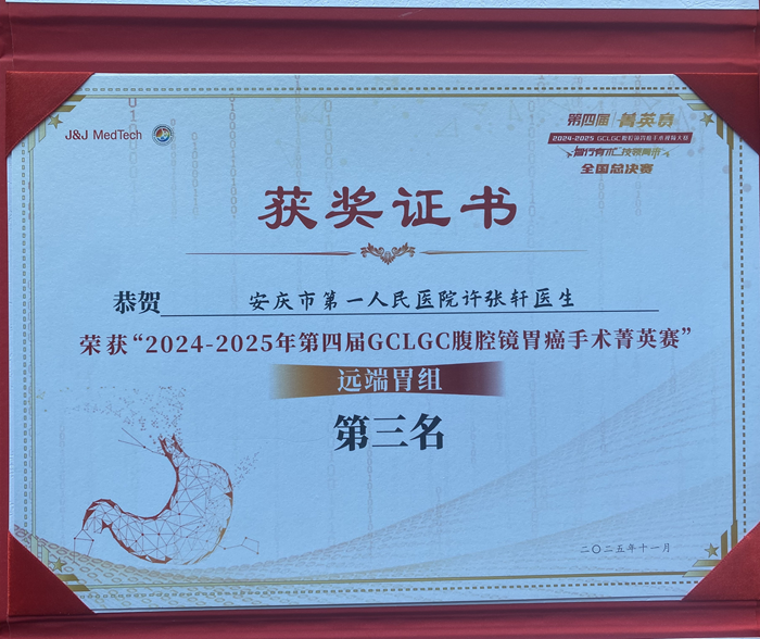 在11月29日于上海隆重举行的“第四届菁英赛——腹腔镜胃癌手术视频大赛”全国总决赛中,安医大附属安庆第一人民医院胃肠外科的许张轩医师不负众望,再传捷报,凭借其精湛的手术技艺、清晰的诊疗思路与沉稳的现场风采,在全国顶尖高手的终极对决中,成功斩获远端胃组第三名的佳绩,并展现出冲击更高奖项的雄厚实力。