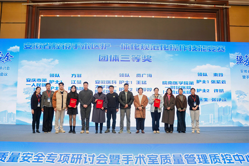 12月5日,安徽省腔镜手术医护一体化规范化操作技能竞赛圆满落幕。安医大附属安庆第一人民医院手术室江曼、徐小咪与宿松县人民医院组成安庆市代表队,凭借扎实的理论基础、娴熟的操作技巧和默契的团队协作,一路过关斩将,最终斩获个人腔镜器械传递、腔镜下缝合二等奖和团体三等奖,充分彰显了我市腔镜手术领域的技术实力与医院手术室护理团队的高质量实操水平。