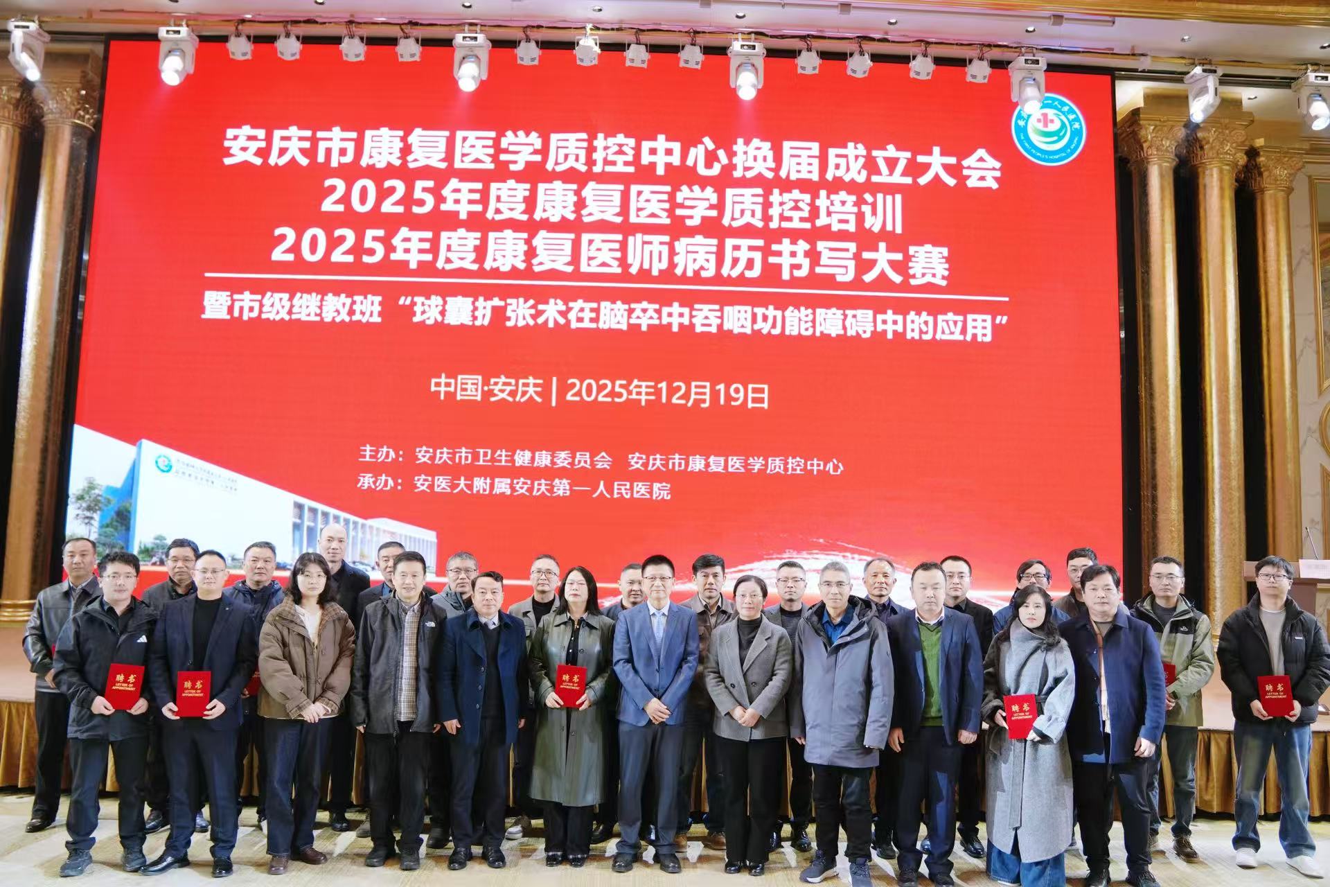 为进一步健全安庆市康复医学质量控制体系,提升康复医疗服务规范化水平,推广康复医学领域新技术、新方法,12月19日,安庆市康复医学质控中心换届成立大会、2025年度康复医学质控培训、2025年度康复医师病历书写大赛暨市级继教班“球囊扩张术在脑卒中吞咽功能障碍中的应用”系列活动顺利开展,安庆市卫健委党组成员、副主任范兰芳、吴显耀,安徽省康复医学质控中心主任高晓平,安医大附属安庆第一人民医院党委书记赵家彬出席,医院党委委员、副院长毕满华主持开幕式,来自全市各级医疗机构的康复医学领域专家学者、业务骨干80余人参加。
