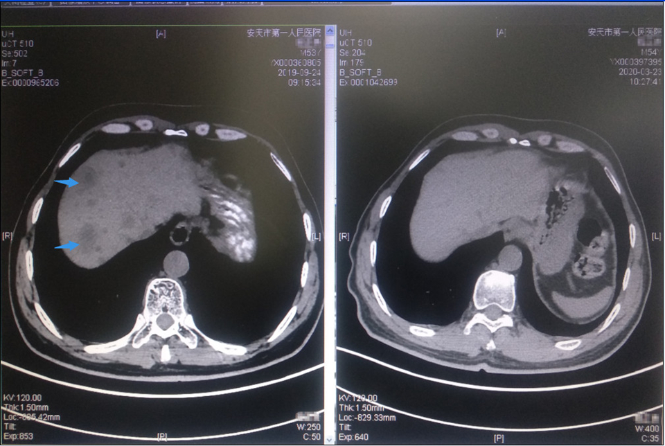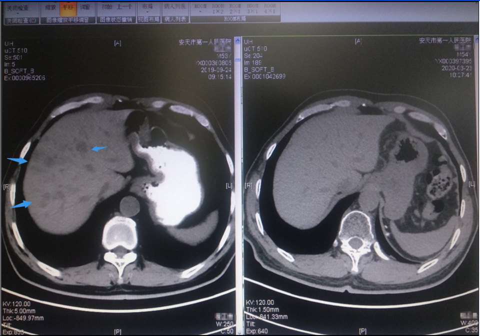 (免疫联合抗血管生成靶向后:箭头示多发肝转移灶消失)