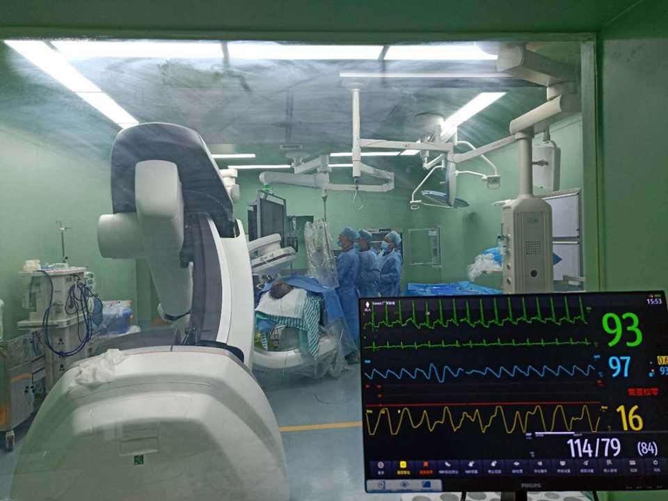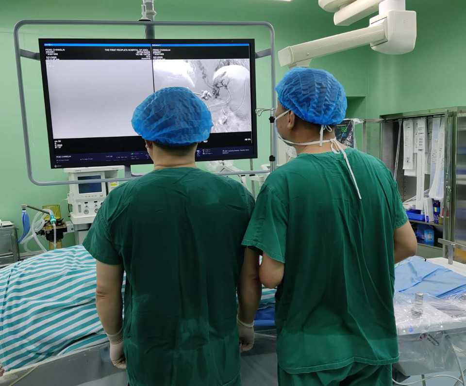患者刘某,男性,40岁,两年前曾因肝脏肿瘤在安庆市一院行部分肝脏切除术,现因患者肝硬化继发脾功能亢进,入住市一院肝胆外科治疗。由于已切除部分肝脏,考虑到患者的身体素质较差及外科手术的巨大创伤和外科手术后的感染等风险,肝胆外科于是请微创介入科金涛主任医师会诊。金涛主任医师了解患者病情及既往病史后,建议患者行改良型部分性脾栓塞术。在完善相关术前检查后,6月17日上午,在龙山院区手术室,金涛主任医师带领徐万里主治医师利用目前国际最先进的西门子飞龙数字减影血管造影机(DSA),顺利完成此例改良型部分性脾栓塞的介入治疗。术后患者血细胞较术前明显改善,且无明显脾区疼痛、脾脓肿等常见介入栓塞后并发症出现。术后第三天患者即康复出院。