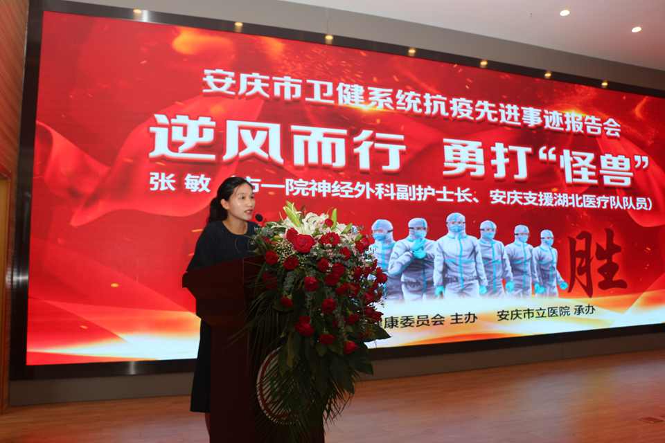 为庆祝“中国医师节”,充分发挥先进典型的示范引领作用,8月19日,市卫生健康委举办安庆市卫生健康系统抗“疫”先进事迹报告会。安庆市第一人民医院神经外科副护士长张敏、新河街道社区卫生服务中心主管护师吴怡婷等同志作为市卫生健康系统抗“疫”先进典型参加了报告会。报告会宣讲介绍了我院“打怪兽妈妈”张敏以及吴怡婷所在“临时妈妈”团队的先进事迹,其中张敏亲自讲述了自己在第一时间奔赴武汉驰援的经历。抗“疫”先进典型们在各自抗“疫”斗争中不畏生死、不计报酬,争分夺秒抢救生命的先进事迹感动着在场的每一个人,现场观众无不动容,掌声此起彼伏。