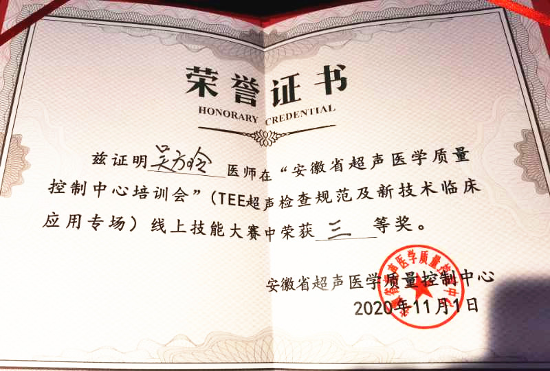 线上还同步举办了安徽省超声医学会质控中心线上知识竞赛,比赛规则为单选多选各十题,答题时间不得超过一刻钟。全省近万人积极参赛,比赛当场决出一等奖1名,二等奖1名,三等奖2名。我院超声医学科吴方玲医师荣获三等奖,为安庆市唯一获得此项荣誉的获奖者。