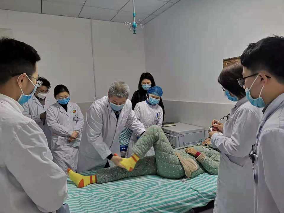 上午八点半,倪朝民不顾坐车劳累,刚到科室就换好白大褂扎进了病房,与科室各位医生、治疗师以及护士一起立即对科内患者进行查房教学。在患者床旁,管床医生首先进行病情汇报,随后倪朝民亲自上前对病人进行各项细致的评估,详细地询问患者康复治疗情况,针对患者当前临床治疗情况提出了自己的建议与见解,并亲自示范了部分患者治疗过程中的康复治疗重点。