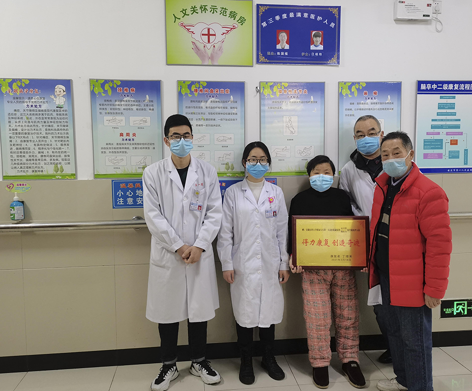 从患者躺着进来,到现在能迈步行走,病人及家属的感激之情溢于言表。出院时,患者家属特意送来一块金色匾额,上书:“得力康复,创造奇迹”。