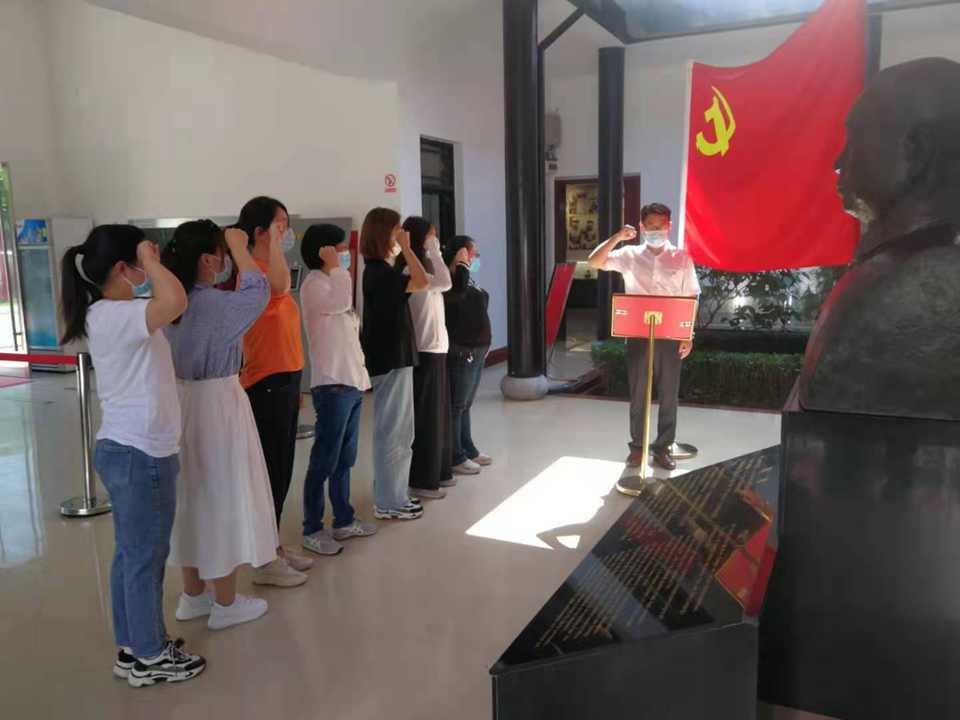 在庄严、肃穆的纪念馆中,全体党员面对鲜红的党旗重温入党誓词。