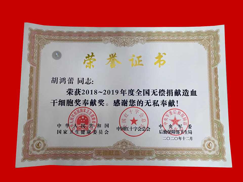 近期,从合肥传来喜讯,安医大附属安庆第一人民医院内分泌科护士胡鸿蕾获得2018-2019年度全国无偿捐献造血干细胞奖奉献奖。
