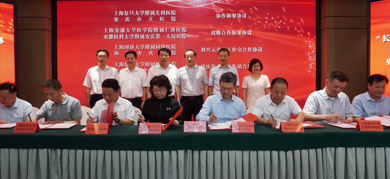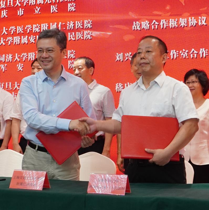 上海交通大学医学院附属仁济医院院长夏强与安医大附属安庆第一人民医院党委书记鲍习化签署协议。