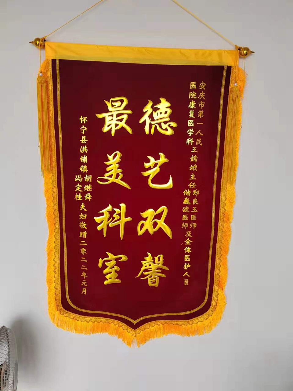一面锦旗,十分肯定。2021年12月31日上午,安医大附属安庆第一人民医院龙山院区康复医学科上演了温馨一幕,科内住院患者冯定桂携爱人胡先生,将写有“德艺双馨、最美科室”的锦旗送至科主任王嫦娥手中,并对龙山康复医学科全体医护人员的精心治疗和护理表达了感激之情。