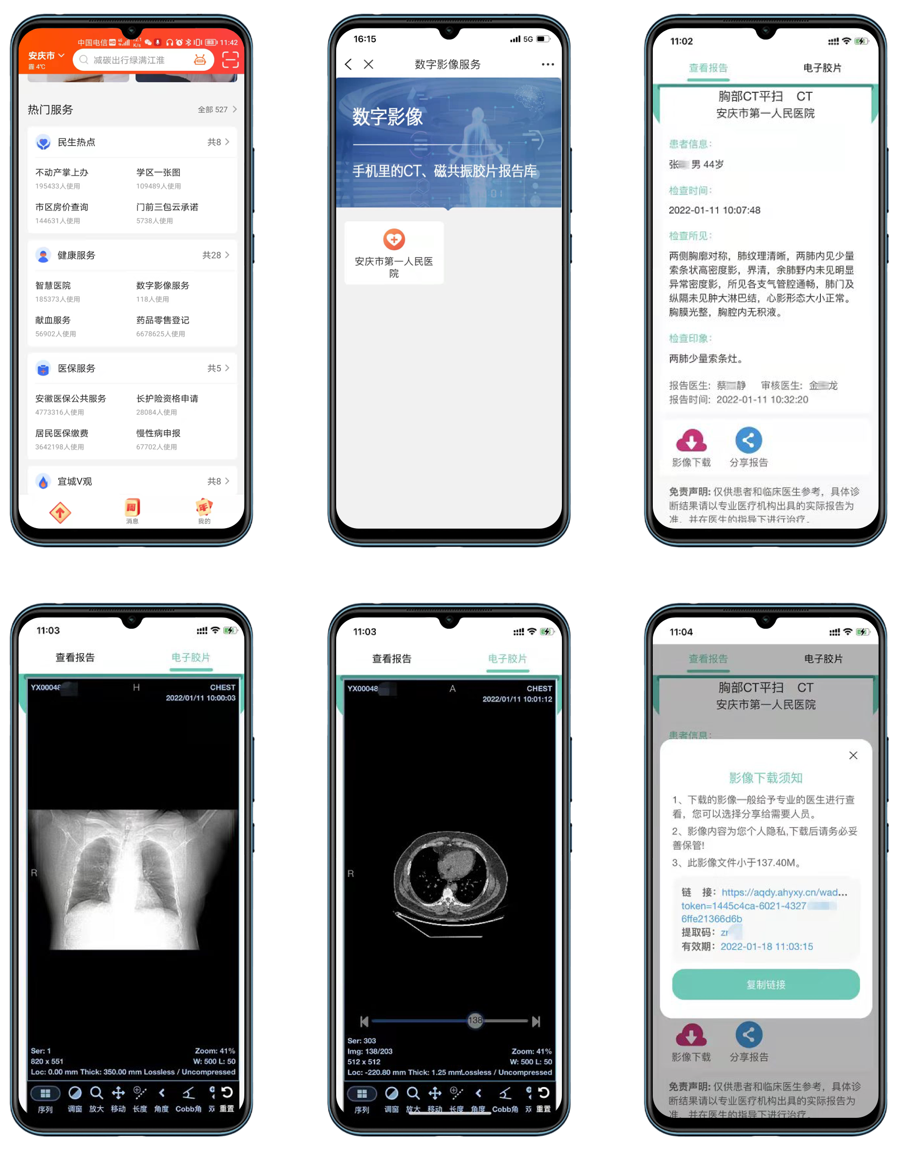 “皖事通”用户在APP左上角定位到“安庆”归属地,选择“健康服务”-“数字影像服务”,或者直接搜索“影像”,2022年1月1日之后的CT、磁共振、放射都可以供本人查询报告和原始医学影像,点击“影像下载”还可以获取原始医学影像网盘地址和提取码,即可将上百兆的原始影像资料下载到电脑上,真正让市民拥有自己的一手健康档案,更加方便会诊和定期随访。
