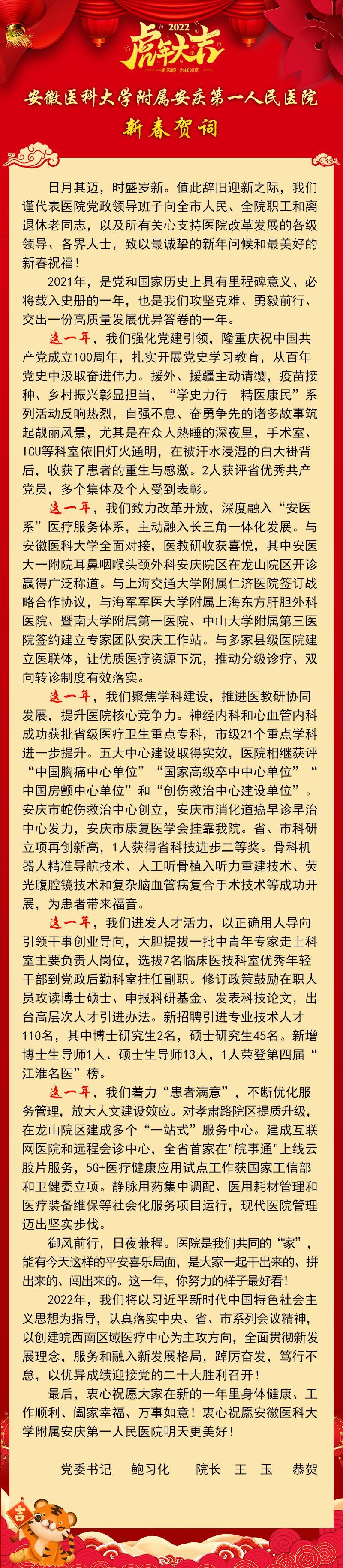 最后,衷心祝愿大家在新的一年里身体健康、工作顺利、阖家幸福、万事如意!衷心祝愿安徽医科大学附属安庆第一人民医院明天更美好!