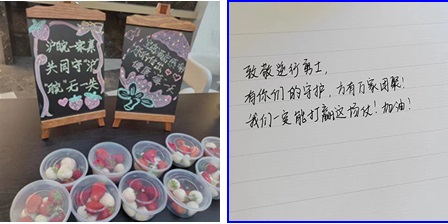 如果说在方舱里我们是保护患者的“铜墙铁壁”,那么出舱后,一想到身后有国家、政府的全力支持保障,有院领导的大力支持,身旁有团结一致的同事和义无反顾的志愿者,我们就迸发出无穷的力量。院党委书记鲍习化、院长王玉多次在百忙之中抽空去援沪队员所在的科室,叮嘱留守的大家坚守岗位,注意医疗安全、疫情防控安全。亲友微信、电话中的关心和叮嘱,酒店送餐时温馨的小纸条等等,都如同一剂强心剂,让我们更加坚定信心沉着应战。这一仗我们必须打,必须赢!共同守“沪”,“皖”无一失,这一战,我们必将胜利,期待上海暖阳遍地、春暖花开。