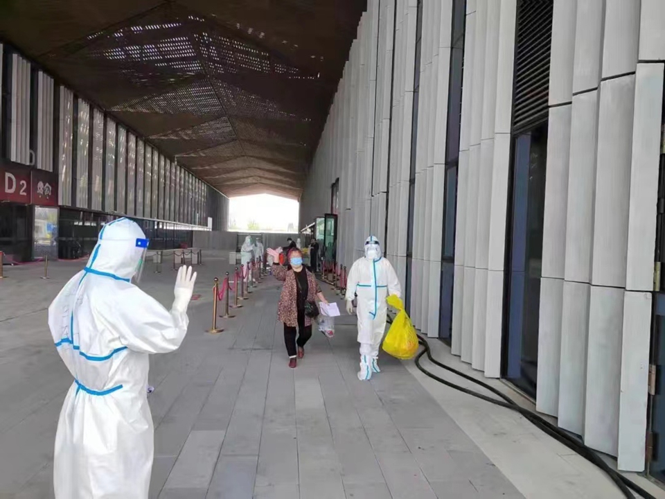 根据《新型冠状病毒肺炎诊疗方案(试行第九版)》要求,专家研究制订了方舱医院出舱标准:即患者同时满足连续两次核酸检测结果阴性(至少间隔24小时)、连续3天无发热状况、呼吸道症状明显改善这三个条件,方可出院。看到患者出院就是我们作为医务工作者最大的欣慰。对于符合条件的出院患者,在出舱前一晚,我们支部党员带头核对患者信息,并细心叮嘱他们出舱后的注意事项。特别是对于消杀后的随身物品,会用准备好的黄色医疗垃圾袋(两层)提前收纳好,不厌其烦地叮嘱他们出院回家过两周方能打开。此外,患者出舱后从出院门到家门严格按照闭环管理,我们医务人员和志愿者会提前做好与属地居委会、街道办的对接,由专用的转运车辆转其回社区并做好7天健康居家观察。