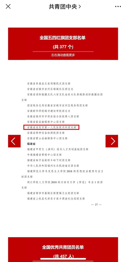近日,共青团中央作出关于表彰全国五四红旗团委(团支部)、全国优秀共青团员、全国优秀共青团干部的决定,安医大附属安庆第一人民医院内科团支部被共青团中央授予“全国五四红旗团支部”称号,成为安庆市卫生健康系统唯一获此殊荣单位。