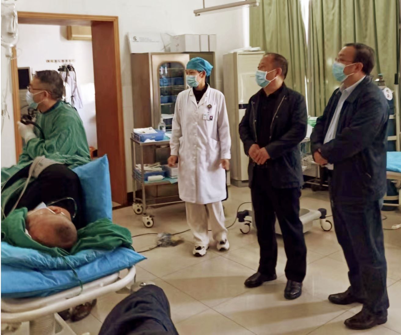 5月3日上午,安庆市卫健委党组成员、安庆市老龄委员会工作处主任王征兵率队来到安医大附属安庆第一人民医院孝肃路院区,看望慰问假日期间坚守岗位的医务人员,并现场督导疫情防控工作。安医大附属安庆第一人民医院党委书记鲍习化、副院长毕满华陪同。
