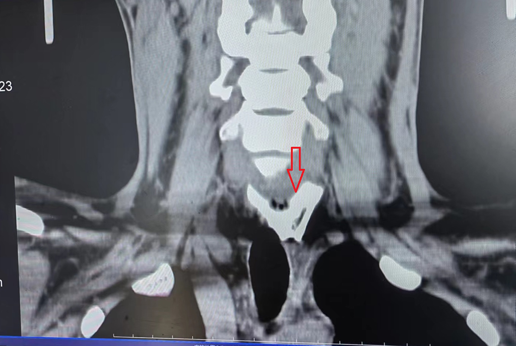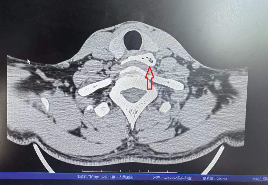 (食管轴位CT影像(箭头所指为食管异物影像))