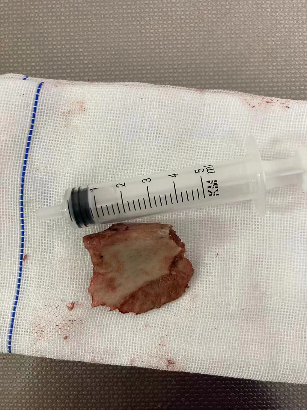 当天,陈先生的母亲为其煮了一碗螺蛳粉,因不知晓这碗螺蛳粉是用骨头汤煮的,粗心的陈先生误吞下一块“巨型”猪骨头。这块猪骨呈长方形,长约4.1cm,宽约3.8 cm,厚度约3mm,四角尖锐,正好卡在食管入口的下方。入院时,患者十分痛苦,说话困难,连口水都无法吞咽,并且“巨型”骨尖锐锋利的边角随时都有穿通食管的可能,一旦造成食管穿孔并发感染,陈先生将会面临生命危险。