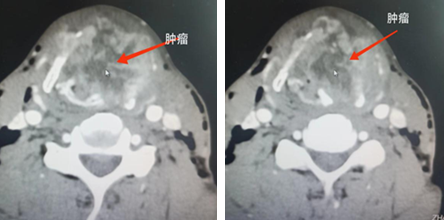 张先生因呼吸困难加重就诊安医大附属安庆第一人民医院,诊断为喉部占位。来时严重呼吸困难,三凹征明显,并发紫绀。耳鼻咽喉头颈外科立即予以气管切开、开放气道,喉部肿瘤活检病理明确为鳞状细胞癌。因肿瘤巨大几乎完全阻塞喉腔,喉结构完全侵犯破坏至颈部软组织,无法通过手术彻底切除,随即转入龙山院区肿瘤科继续治疗。