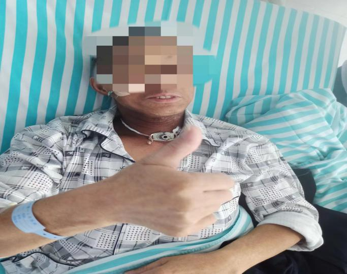 因为病程拖得过久,患者除了呼吸、言语等功能严重受损外,进食也受到影响,就诊时已合并较严重的营养不良。肿瘤科头颈肺部肿瘤治疗组何宜生、吕杨两位主治医师,在组长鲍亮亮副主任医师的带领下,组织营养科、耳鼻咽喉头颈外科、影像中心、护理部等多学科会诊,对患者的病情进行了准确细致的评估,根据张先生的病情制定了同步放化疗联合营养干预和强化护理干预的综合治疗方案,同时反复耐心地与患者及家属沟通交流,树立患者战胜病痛的信心。由于肿瘤巨大,加上患者营养不良,治疗过程中及时评估和适时调整治疗方案显得尤为重要。营养科制定了肠内肠外营养支持向完全膳食过渡的“降阶梯”营养干预方案;肿瘤科则根据肿瘤退缩程度,行同步放化疗抗肿瘤治疗方案;为了最大程度地降低感染发生率、改善呼吸和降低不适感,护理团队则特别加强了与患者的沟通和心理护理,并定期从喉镜下了解肿瘤退缩程度来更换与气道开放程度适配的气管套管。患者不能发音且不会写字,医护人员一直耐心地用手势与其交流,鼓励其战胜疾病。