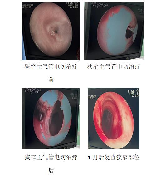 半年前,58岁的男性患者吴某因车祸致脑外伤及胸部外伤,进行手术及气管插管机械通气,因气切套管留置时间长,出现气管瘢痕增生性狭窄超过80%,呼吸困难症状明显,影响患者生命,急诊入住安医大附属安庆第一人民医院呼吸与危重症医学科。李乾兵主任医师组织全科讨论,决定对患者急诊进行喉罩通气下气管内气管增生性瘢痕环切(电切、冷冻消融)及球囊扩张治疗,以改善患者通气。7月28日,征得患者及家属同意后,在内镜下进行电切、冷冻、球囊扩张治疗。患者予以麻醉喉罩通气时,因主气道严重狭窄,出现通气困难、血氧、血压下降,李乾兵主任、王智胜副主任医师、陈建主治医师和麻醉科通力配合,果断采取气管瘢痕增生性狭窄部位电切,数秒后患者通气状况改善,患者血氧、血压水平恢复正常。此后,通过电切、冷冻及球囊扩张治疗,患者气道通畅。术后第二天患者下床进行日常活动。9月1日复查,患者原瘢痕增生性狭窄气管管腔狭窄小于30%,管腔通气良好,已经能够正常工作。