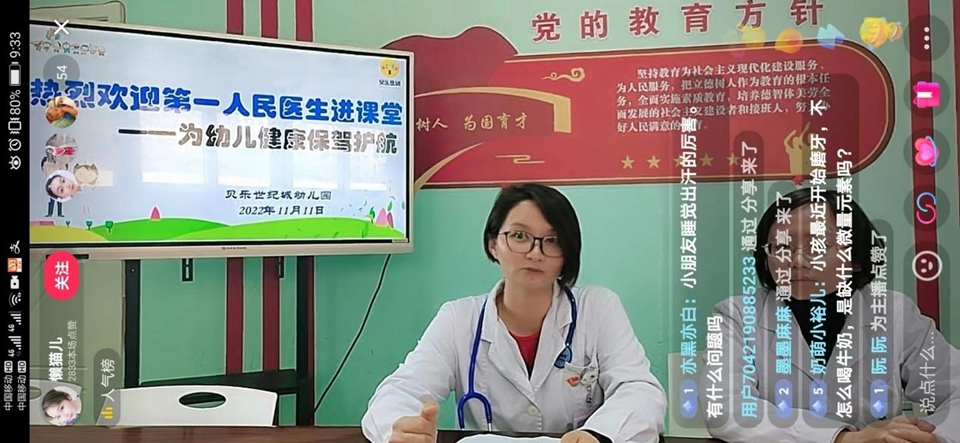 活动中,医护人员在现场为贝乐幼儿园老师讲解了儿童卫生保健、营养教育等方面的知识和技能。除此之外,医护人员还利用互联网采用线上互动模式与学生家长代表沟通交流,回答了家长们对于儿童保健的一些疑问并科普了一些儿童健康生长发育“小妙招”及幼儿卫生保健、营养教育、常见疾病相关知识,希望他们多关注儿童早期发展,不断提升幼儿园儿童健康管理水平。
