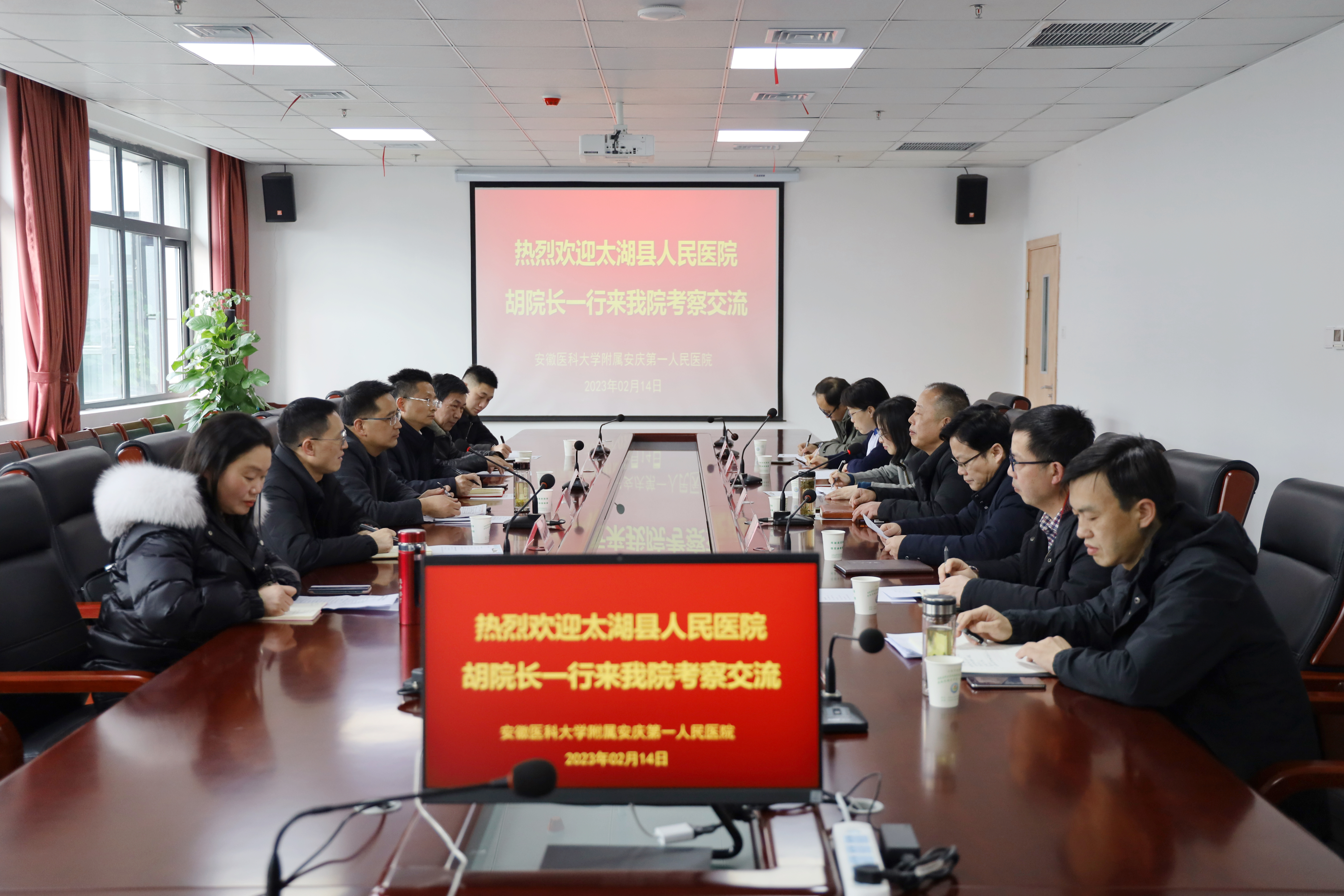 2月14日下午,太湖县人民医院胡小林院长一行到我院龙山院区,考察交流三级医院创建、招投标管理、护理管理等先进经验与做法。我院党委书记鲍习化、党委副书记、院长王玉、副院长李小月及相关职能科室负责人陪同并座谈。