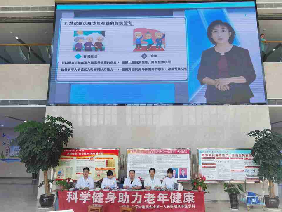 为实施积极应对人口老龄化国家战略,宣传普及老年健康政策和科学知识,切实提高老年人健康素养和健康水平,2023年7月27日,安医大附属安庆第一人民医院在龙山院区门诊大厅开展以“科学健身助力老年健康”为主题的老年健康宣传周活动。