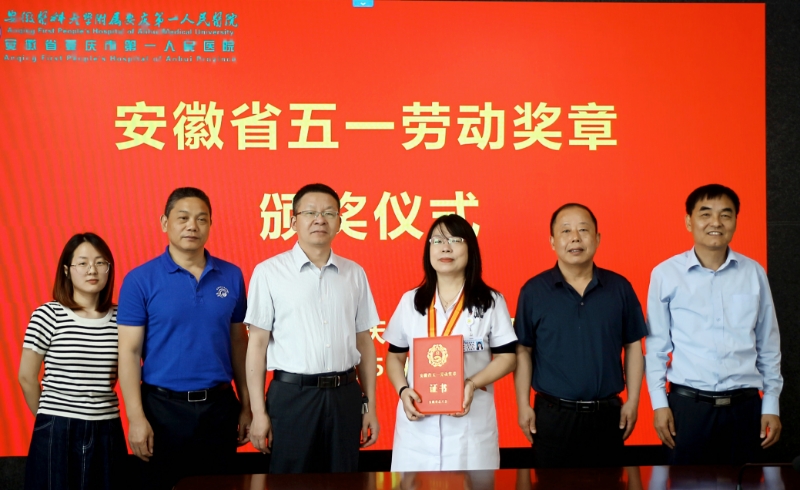为表彰先进典型,弘扬劳模精神,5月29日上午,安庆市总工会党组成员、副主席王华六一行来到安医大附属安庆第一人民医院,为省五一劳动奖章获得者、康复医学科主任王嫦娥颁奖。