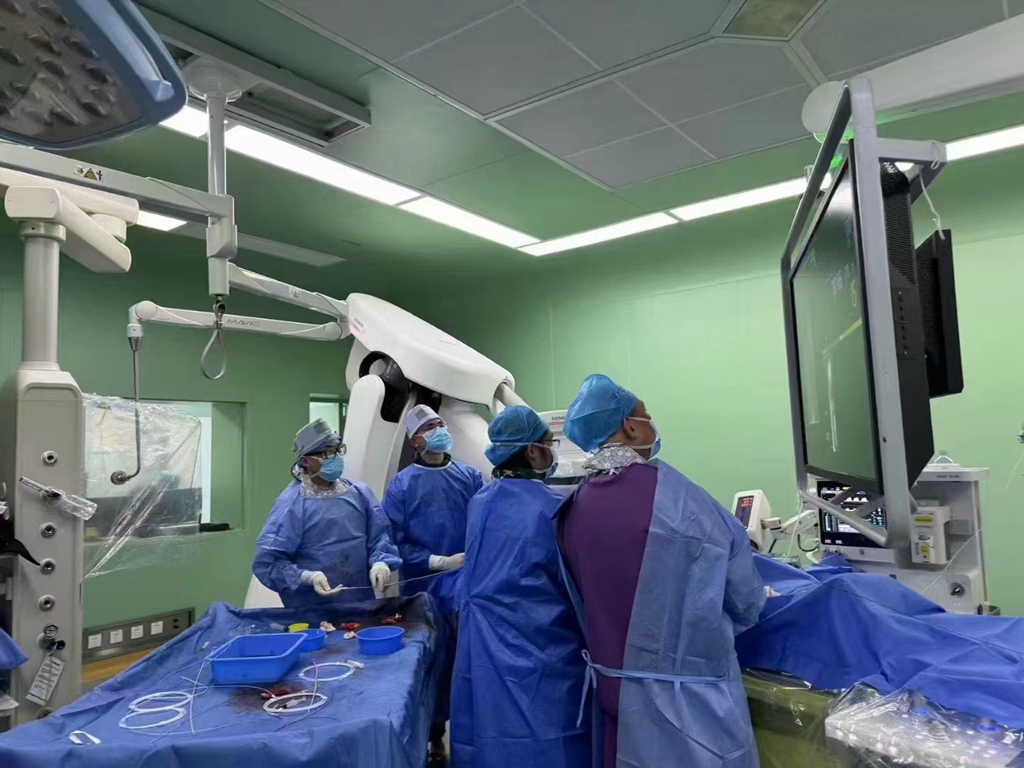 但下一个难题再次摆在面前,蒋大哥因之前多次行手术治疗,体内的血管解剖改变很大,CT显示之前的分流支架闭塞、门静脉内血栓形成,想要再次开通分流道或重新建立新的分流道几乎无希望,破裂的曲张血管来源于侧枝血管,想要找到破裂出血的血管源头绝非易事,手术难度非常高,一旦失败患者将失去救治希望。进一步手术风险巨大,退一步患者可能会失去最后的机会,一时间所有人都陷入了艰难的抉择。介入与血管外科再次组织科内讨论,提出了大胆的设想,既然常规的技术无法解决问题,就另辟蹊径采用非常规的“逆向技术”来打通闭塞的分流道,决定迎难而上、挑战危疾。