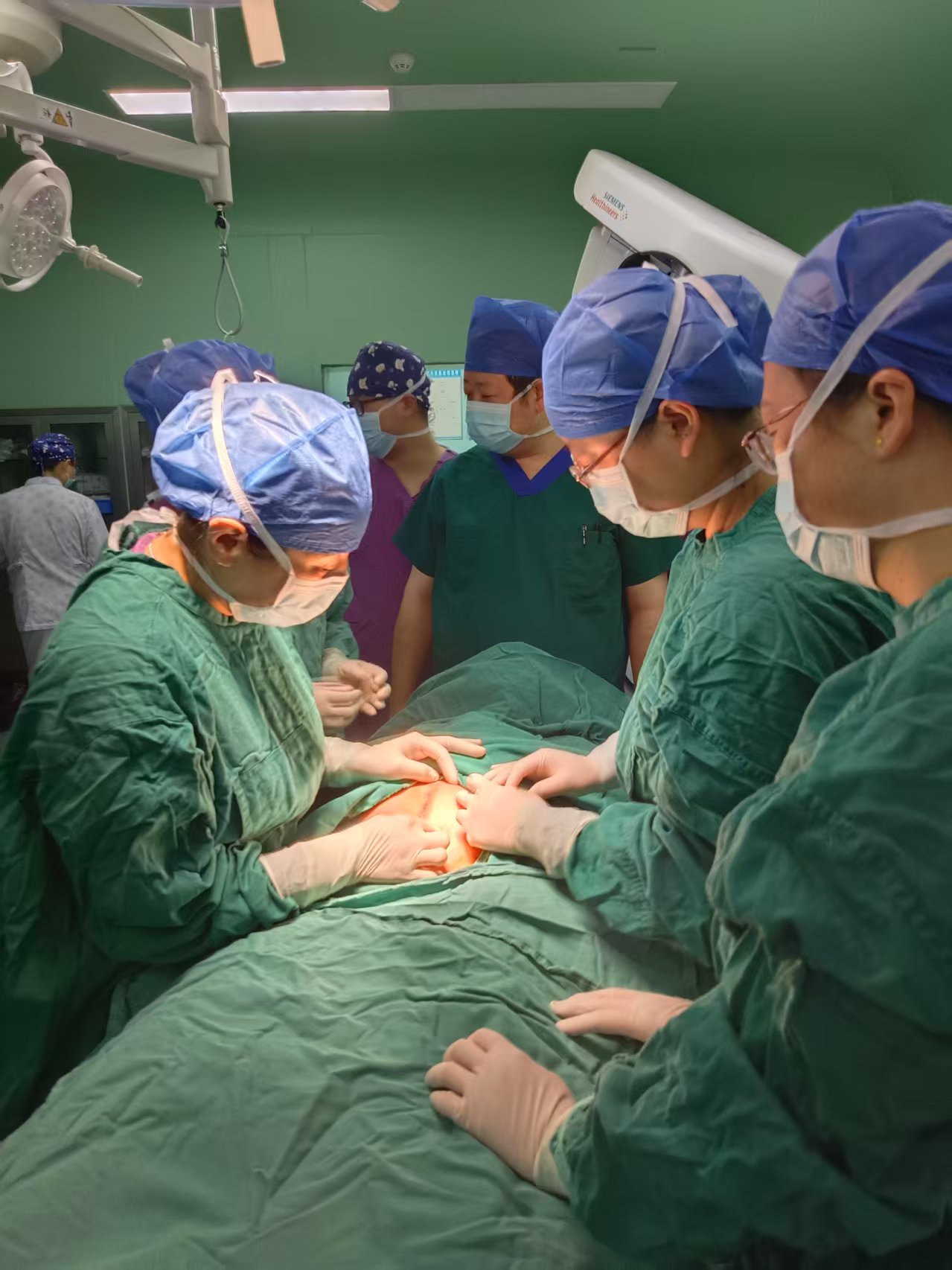 由于孕妇胎盘位于右前壁,完全覆盖子宫下段下缘达宫颈内口,不能从常规手术位置开刀,术前,超声科医生在手术床旁精确定位了手术切入口,术中麻醉科王辉主任医师带领团队密切监护患者生命体征。因患者曾在多年前行剖宫术,术中子宫前壁,右前壁与腹壁广泛致密粘连,分离十分困难,虽然手术中渗血明显,影响手术进程,但妇科团队凭着丰富的经验,十几分钟的时间, 顺利将胎儿取出。台下早已等候的助产士及儿科医师马上接力,予以吸氧,吸痰,随着一声响亮的啼哭,大家提着的心,终于放下。重2300g,Apgar评分8-9分,转新生儿科!