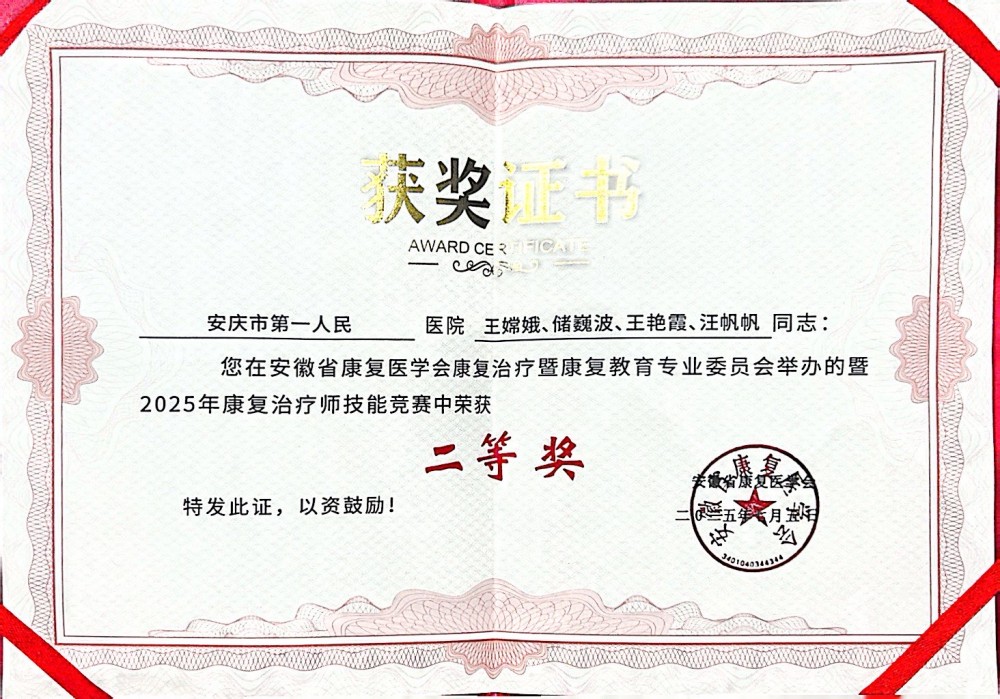 7月6日,由安徽省康复医学会、安徽省中医药健康协同创新会、安徽医科大学第一附属医院主办,安徽省康复医学会康复治疗暨康复教育专业委员会、安徽省中医药健康协同创新会中西医结合康复分会、安徽三联学院共同承办的“2025年康复治疗师技能竞赛”圆满落下帷幕。安医大附属安庆第一人民医院康复医学科团队凭借扎实的专业功底和出色的团队协作,在全省54支参赛队伍中脱颖而出,荣获二等奖。