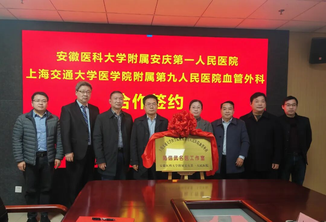 12月28日,安徽医科大学附属安庆第一人民医院与上海交通大学医学院附属第九人民医院血管外科合作签约暨名医工作室揭牌仪式在医院龙山院区举行。上海九院血管外科主任陆信武,市卫健委党组成员、副主任范兰芳,医院党委书记赵家彬出席并致辞,上海九院专家,医院领导班子成员、相关职能科室及临床负责人参加。医院党委委员、副院长毕满华主持。