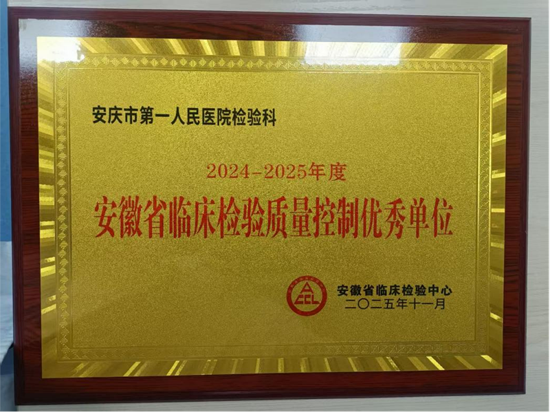 近日,安徽省临床检验质控中心公布了2024-2025年度临床检验质量控制优秀单位名单,安徽医科大学附属安庆第一人民医院检验科凭借持续优异的质量控制管理表现,荣获“安徽省临床检验质量控制优秀单位”称号。