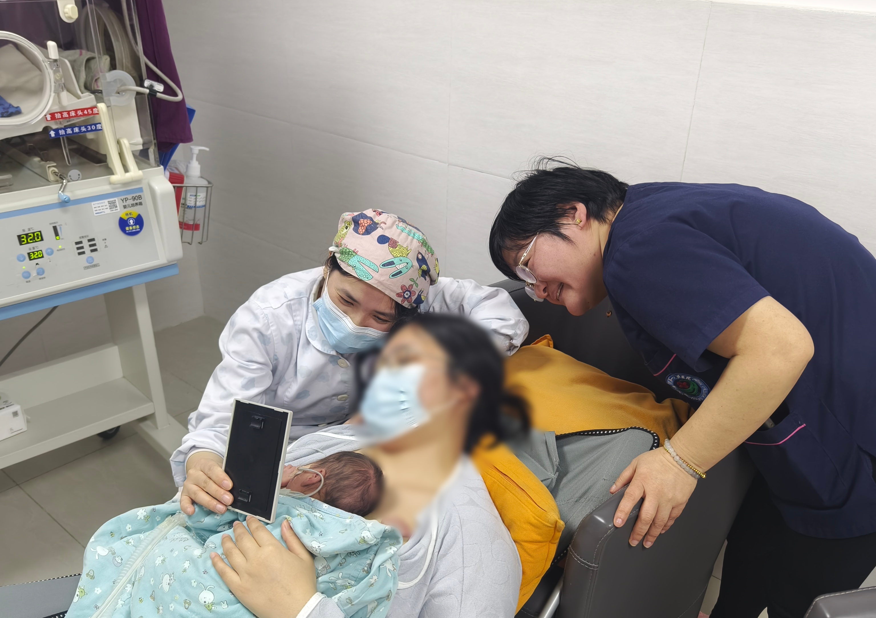 为了守护春节团圆的期盼,刘丽洁副护士长及杨潘婷主治医师周密准备,给还在使用无创呼吸机的27+2周早产儿“小安安”进行袋鼠式护理,在护士长的示教下,李女士解开贴身衣服,将小安安俯卧在胸前。在医护人员的全程陪同下,母子俩通过皮肤接触传递着温度;这是入院两个月来母子的第一次亲密接触,监护仪上的曲线随着母子呼吸同步波动,小安安萌萌地睁开眼睛,李女士轻声哼唱起摇篮曲,这一幕让在场的医护人员无不动容。“他在我怀里睡得特别香,这是我春节收到的最好礼物。”李女士激动地哽咽道。