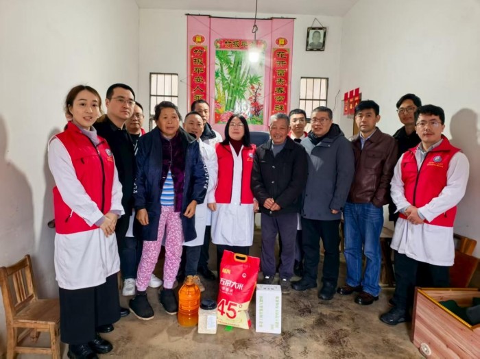 义诊结束后,在凉泉乡卫生院工作人员陪同下,团队深入3户困难群众家中走访慰问。每到一户,大家与群众亲切交谈,详细了解生活状况、身体情况和就医难题,送上大米、食用油、面粉、牛奶等生活慰问品;并针对患病情况提供个性化康复指导、居家护理建议及规范用药指引,真正把专业医疗服务与暖心关怀送到群众心坎上。