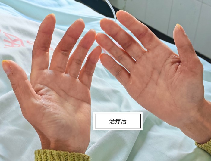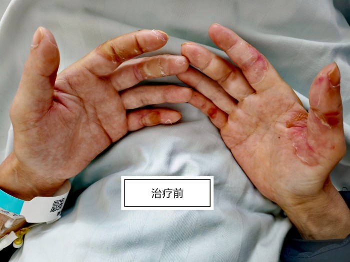 拥有30余年乙肝病史的胡先生,于2023年4月确诊肝细胞癌,并先后接受两次手术。2025年,因肿瘤出现转移,他开始口服靶向药物甲磺酸阿帕替尼,病情一度得到控制。然而同年12月,突如其来的严重皮肤不良反应将他推向深渊:双手对称性红斑、肿胀、深度皲裂伴随大面积脱皮,疼痛评分高达8分,日常生活无法自理。